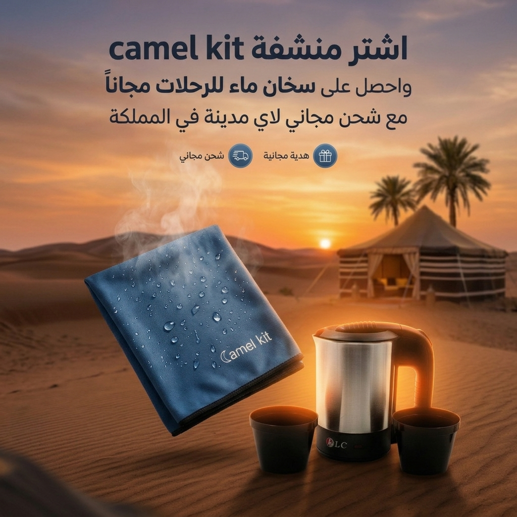 استعد لرحلاتك بأذكى شكل ممكن مع عرض Camel Kit المميز. اشترِ منشفة مايكروفايبر عالية الجودة، واحصل على سخان ماء مخصص للرحلات مجانًا – كل ده مع شحن مجاني لأي مدينة داخل المملكة.